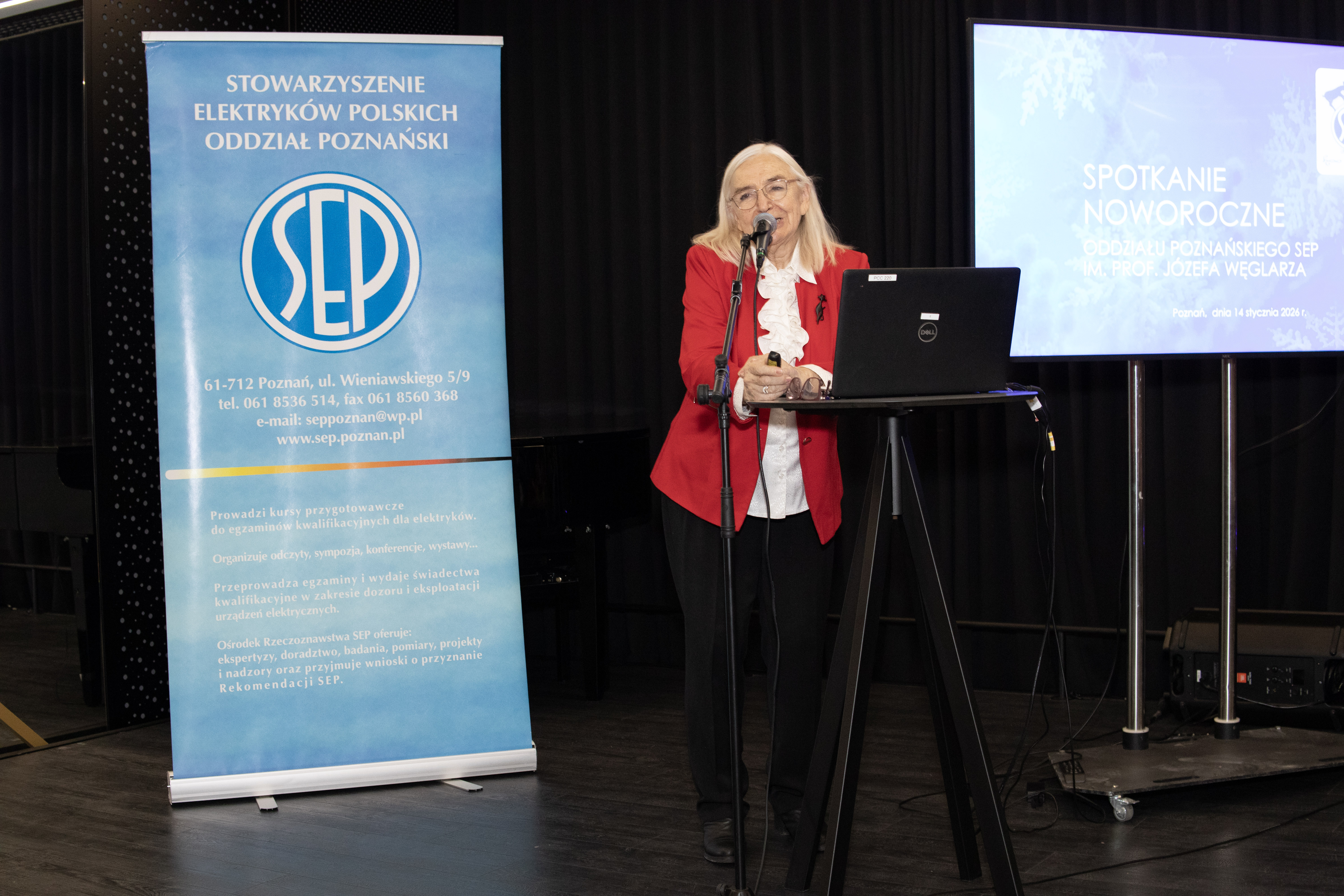 Następnie Koleżanka Prezes Aleksandra Rakowska wspomniała zmarłych – chwilą ciszy uczczono pamięć Tych, który odeszli w minionym roku – byli to Zasłużeni Seniorzy SEP: Kolega Zbigniew Pawuła z Koła SEP nr 75, Kolega Michał Rakowski z Koła SEP nr 21 i Kolega Henryk Kaczmarek (1.01.2026.) z Koła SEP nr 10 oraz Kolega Łukasz Gorgolewski z Koła SEP nr 5, Kolega Leszek Grobelny z Koła SEP nr 39, Kolega Paweł Karolczak z Koła SEP nr 4, Sławoj Tomowiak z Koła SEP nr 9, a także Pani Barbara Królikowska z Biura OP SEP. W dalszej części swego wystąpienia Koleżanka Prezes przedstawiła krótką informację o działalności i osiągnięciach Oddziału w roku 2025. Poinformowała również zebranych, że w dniu 8 stycznia br. Członek Honorowy SEP – Kolega Profesor Czesław Królikowski ukończył 100 lat życia. W imieniu własnym i całego Oddziału Poznańskiego SEP złożyła Jubilatowi serdeczne Życzenia, a ze względu na stan zdrowia Profesora Uroczystość Jubileuszowa w OP SEP przewidywana jest w terminie późniejszym.
