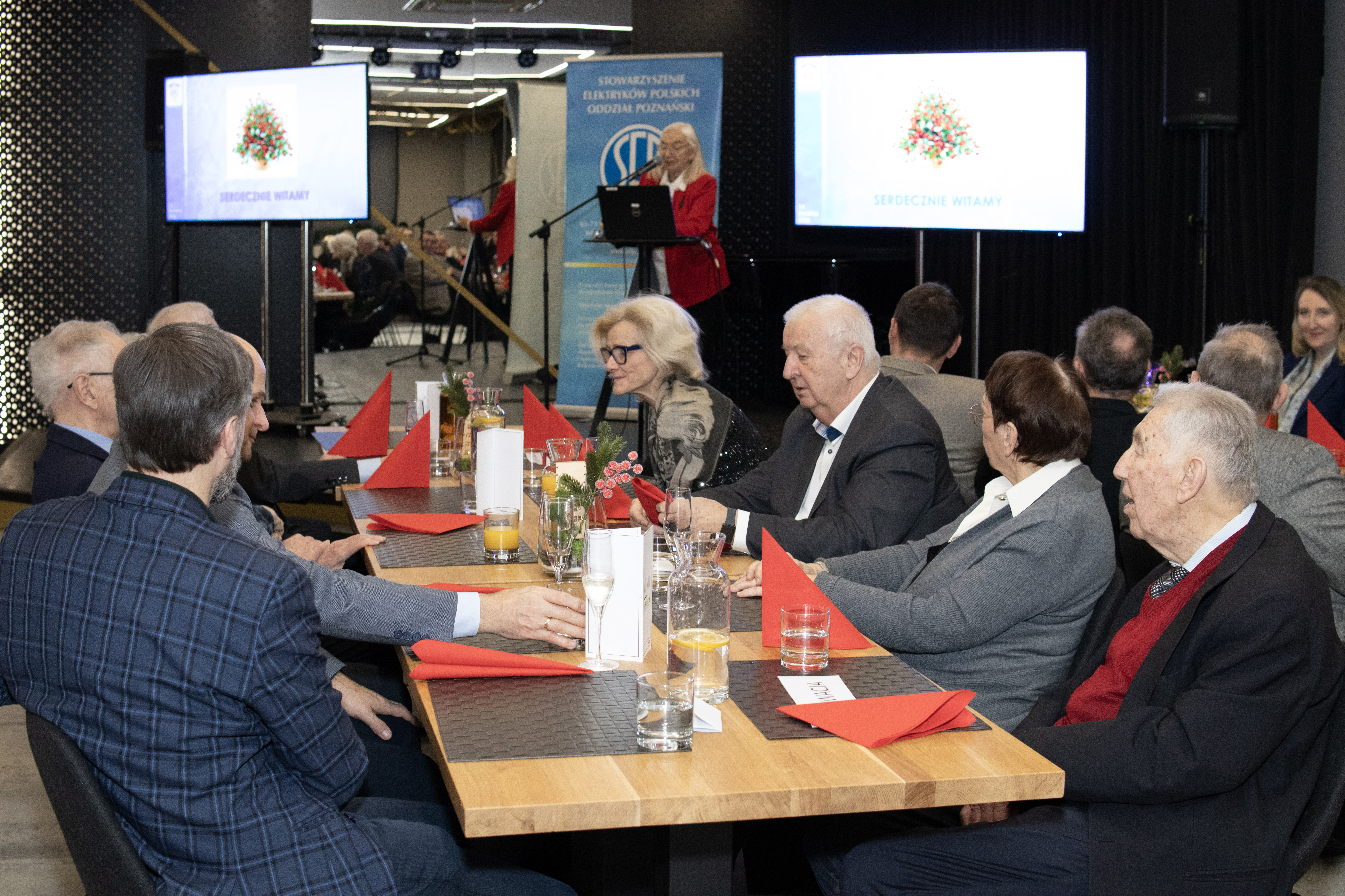 14 stycznia 2026 roku w Garden City na terenie MTP w sali „Oregano & Wine” w Poznaniu odbyło się tradycyjne noworoczne spotkanie działaczy i sympatyków Oddziału Poznańskiego SEP im. Prof. Józefa Węglarza. Uczestników spotkania – w liczbie blisko 70 osób – powitała Prezes Oddziału Poznańskiego SEP Aleksandra Rakowska. Spośród przybyłych Gości przywitała m.in.: Profesora Arkadiusza Ptaka – Prorektora Politechniki Poznańskiej ds. Rozwoju i Współpracy Gospodarczej, Profesora Andrzeja Demenko – wiceprzewodniczącego Komitetu Elektrotechniki PAN i przewodniczącego Komisji Nauk Elektrycznych Oddziału Poznańskiego PAN, Dyrektora Jacka Krawczyka i Wicedyrektora Wojciecha Kasprzaka z Polskich Sieci Elektroenergetycznych S.A., Kierownika Biura Innowacji ENEA S.A. – Krzysztofa Hajdrowskiego, Dyrektora Rejonu Dystrybucji Poznań ENEA Operator – Macieja Pawlickiego, Prezesa Firmy ASTAT z Poznania – Romualda Wintera, Pełnomocnika Zarządu Firmy MIKRONIKA z Poznania – Mirosława Jagodę, Przedstawiciela VDE – Marka Durę, Dyrektor Technikum Energetycznego w Poznaniu – Małgorzatę Grzymską, Wicedyrektor Zespołu Szkół nr 2 w Swarzędzu – Joannę Ratajczak, Przewodniczącą Oddziału Poznańskiego PTETiS – Dorotę Stachowiak, Prezesa Radosława Szczerbowskiego i Wiceprezesa Jana Firlika z FSNT-NOT Rada w Poznaniu, Członków Honorowych SEP i Zasłużonych Seniorów SEP z Oddziału Poznańskiego, Przewodniczących Sekcji Branżowych, Prezesów Kół oraz Wszystkie Koleżanki i Kolegów przybyłych na spotkanie. Ze względu na zaistniałe trudności komunikacyjne, gratulacje i życzenia dla Oddziału Poznańskiego SEP od Prezesa SEP – Kolegi Profesora Sławomira Cieślika, przekazał zebranym Wiceprezes OP SEP Kazimierz Pawlicki.